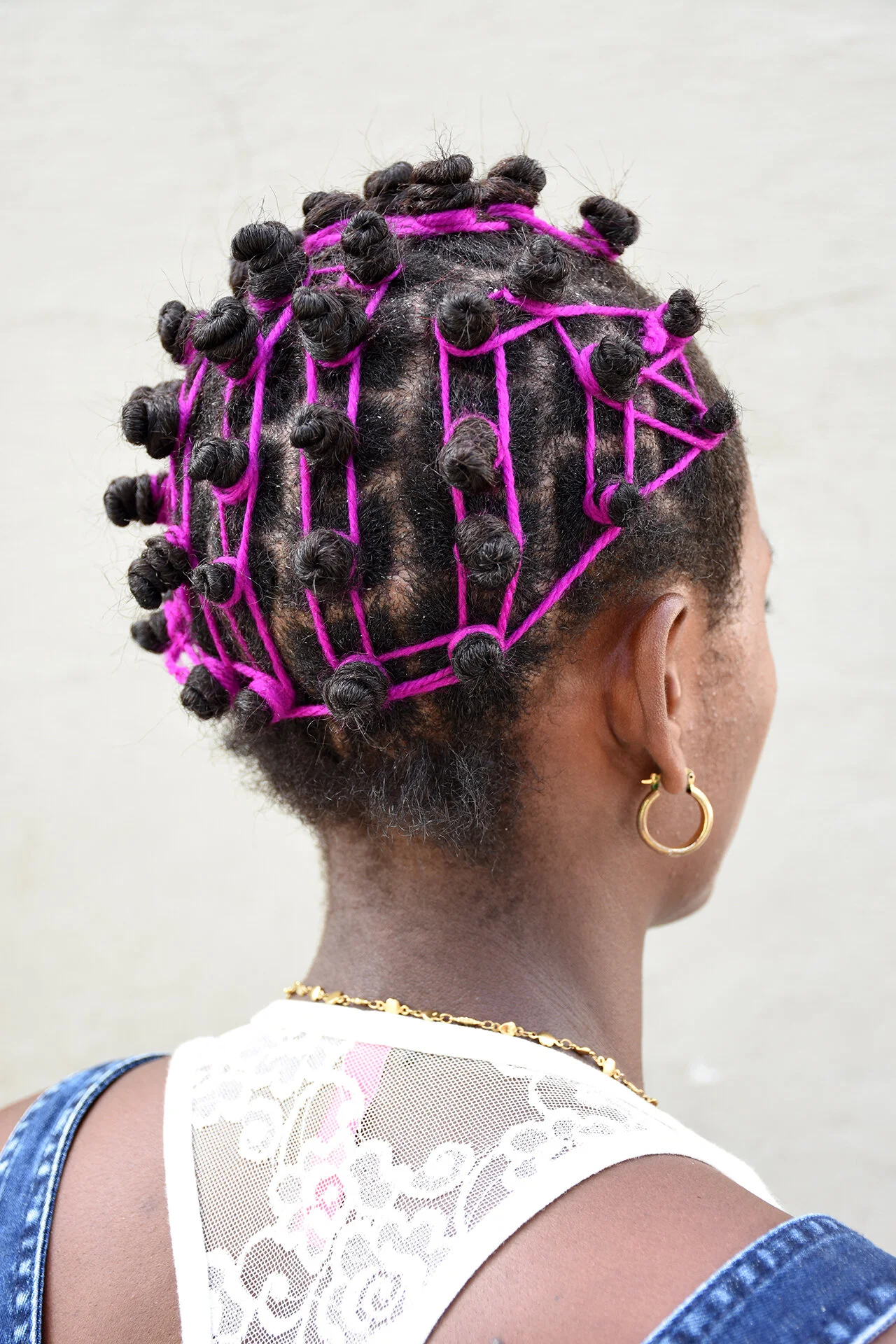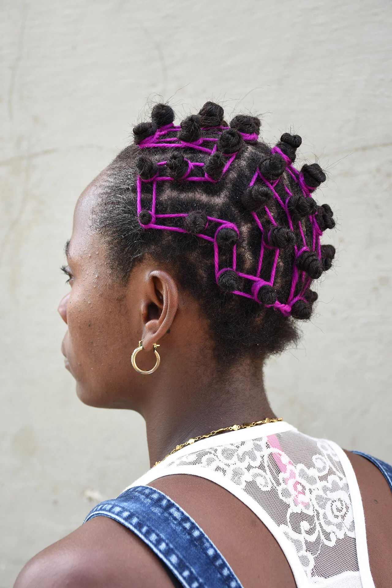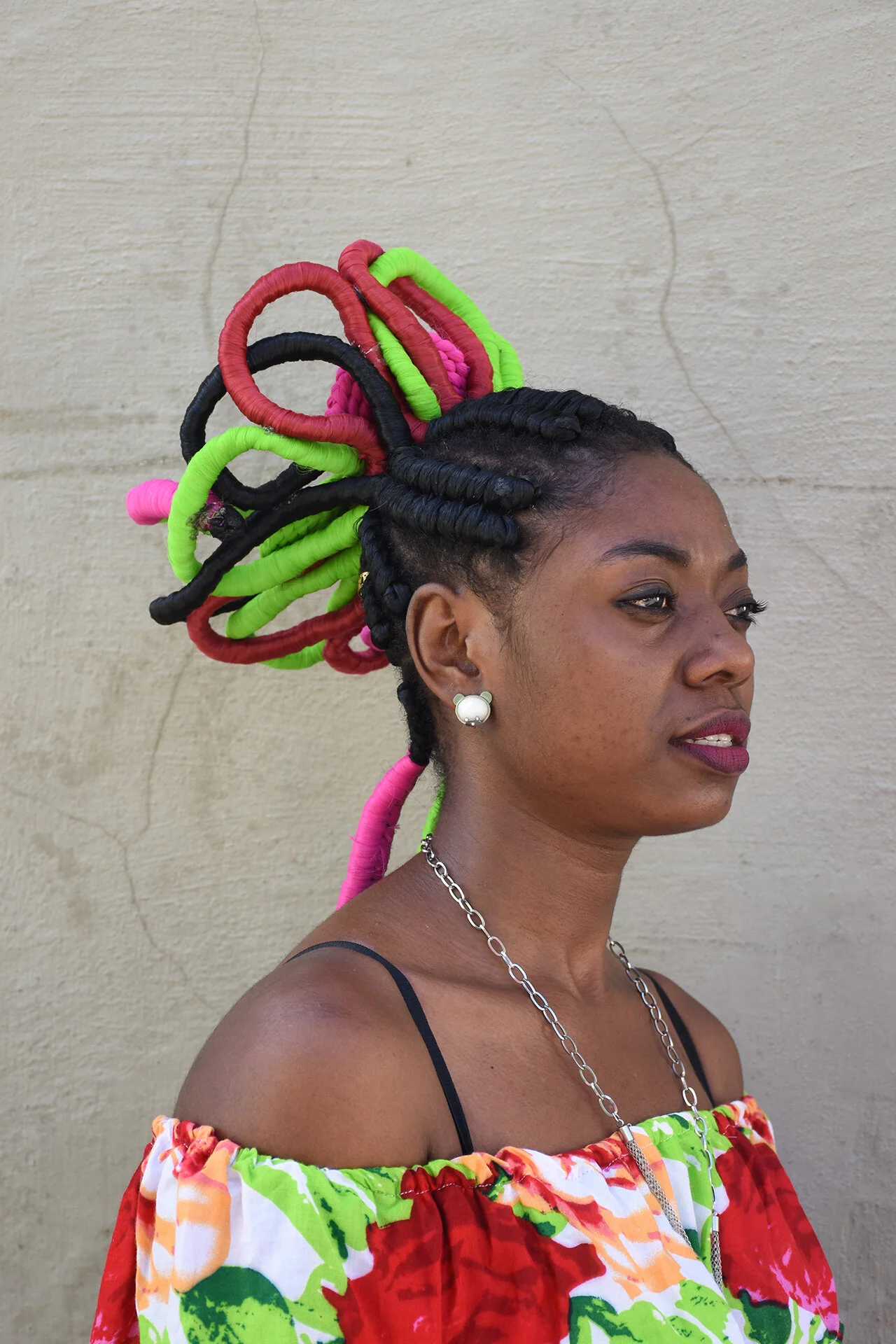 In her series, Project Quieto Pelo, Angulo Cortés documents the global sense of identity of the African diaspora via braided hair designs in Colombia, other countries from Latin America, and the US, uniting people from these distinct areas, despite their linguistic and cultural differences created by colonialism.