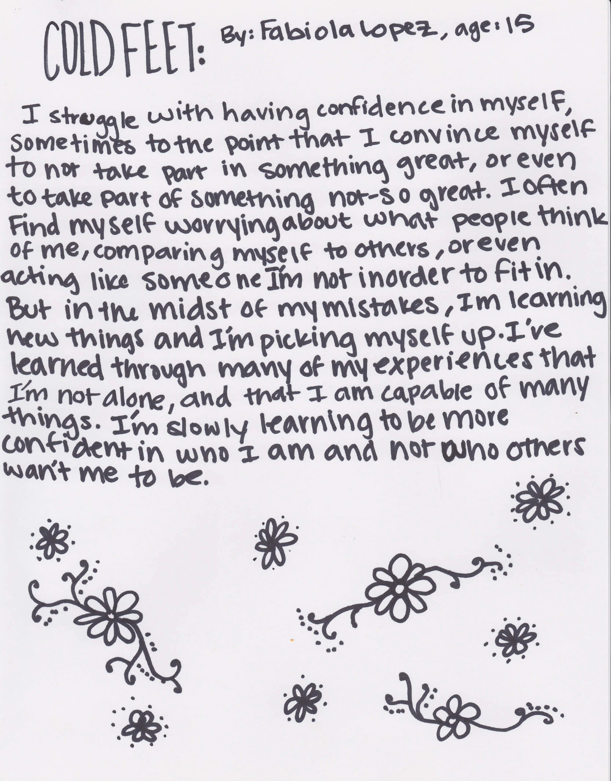 “Cold Feet is a phrase used to describe fearfulness or loss of confidence, which is something I’ve experienced again and again. I often find myself worrying about what people think of me, comparing myself to others, or even acting like someone I’m not in order to fit in. I’m slowly learning to be more confident in who I am, not who others want me to be.”