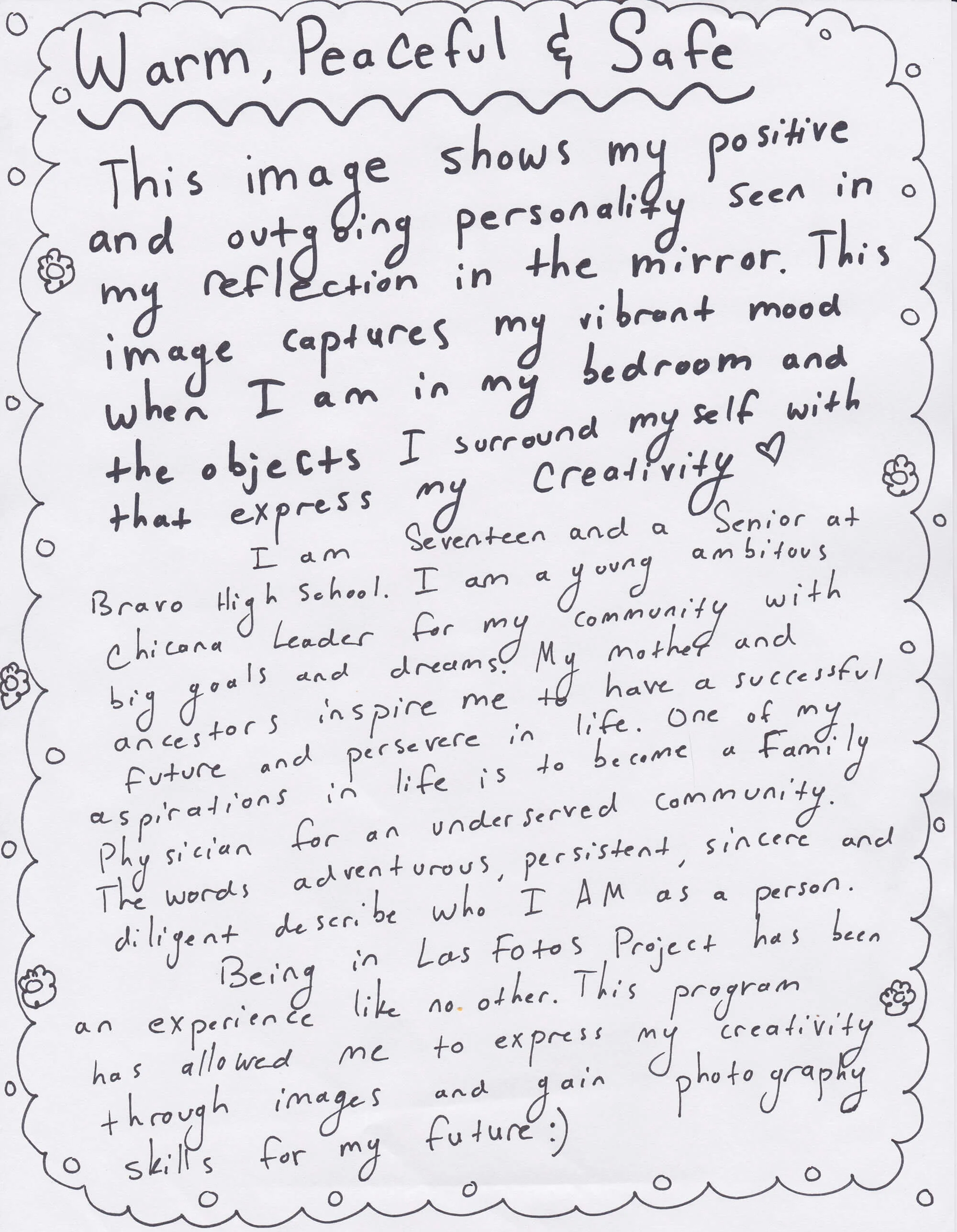 Being in Las Fotos Project has been an experience like no other. I have build a strong bond with my mentor as well as with the other girls in the program. I have enjoyed being able to learn new photography skills and techniques through this program. In addition, Las Fotos Project has allowed me to get insight of what it’s like to live in a different country. Being able to interact with other girls that are several miles away has been extremely rewarding. Las Fotos Project Exchange has been of great value to me and allowed me to compare my life with the exchange girls from other countries.
