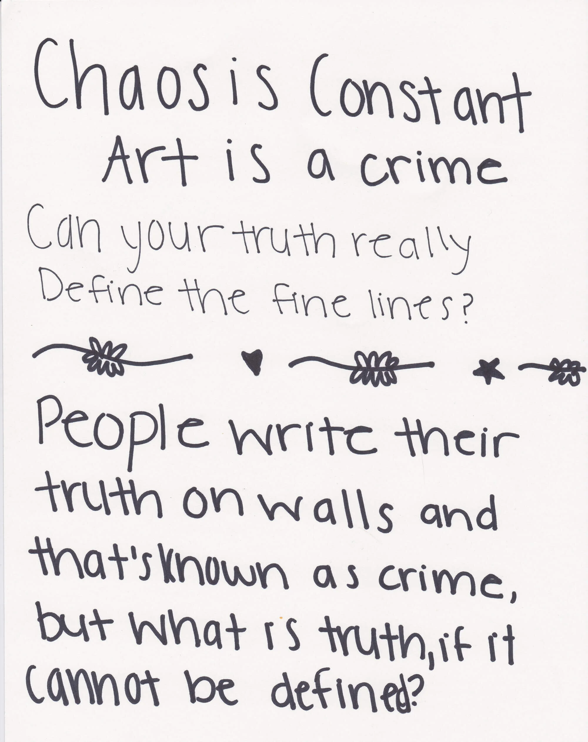 Chaos is constant, art is crime. Can your truth really define the fine lines? / El caos es constante, el arte es delito. ¿Puede tu verdad realmente definir las líneas finas?, 2016