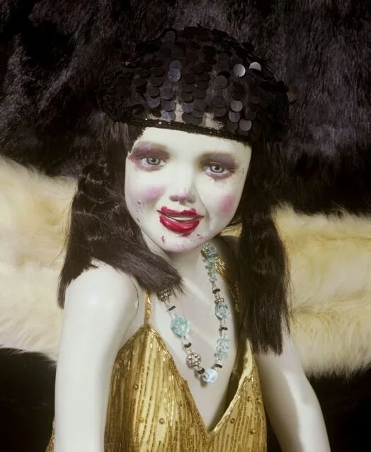 Priscilla Monge explores issues of power, gender and love through her photography. Maita in a Gold Dress portrays a doll modeling an elegant ensemble, yet her make-up was not applied carefully, perhaps on purpose. Maita may symbolize a little girl playing dress-up, or somebody who feels pressured to look beautiful and provocative. Monge’s photograph speaks to the unattainable standards of femininity that many women encounter in today’s society. She provokes her viewers through a visual language that is forceful yet relatable.