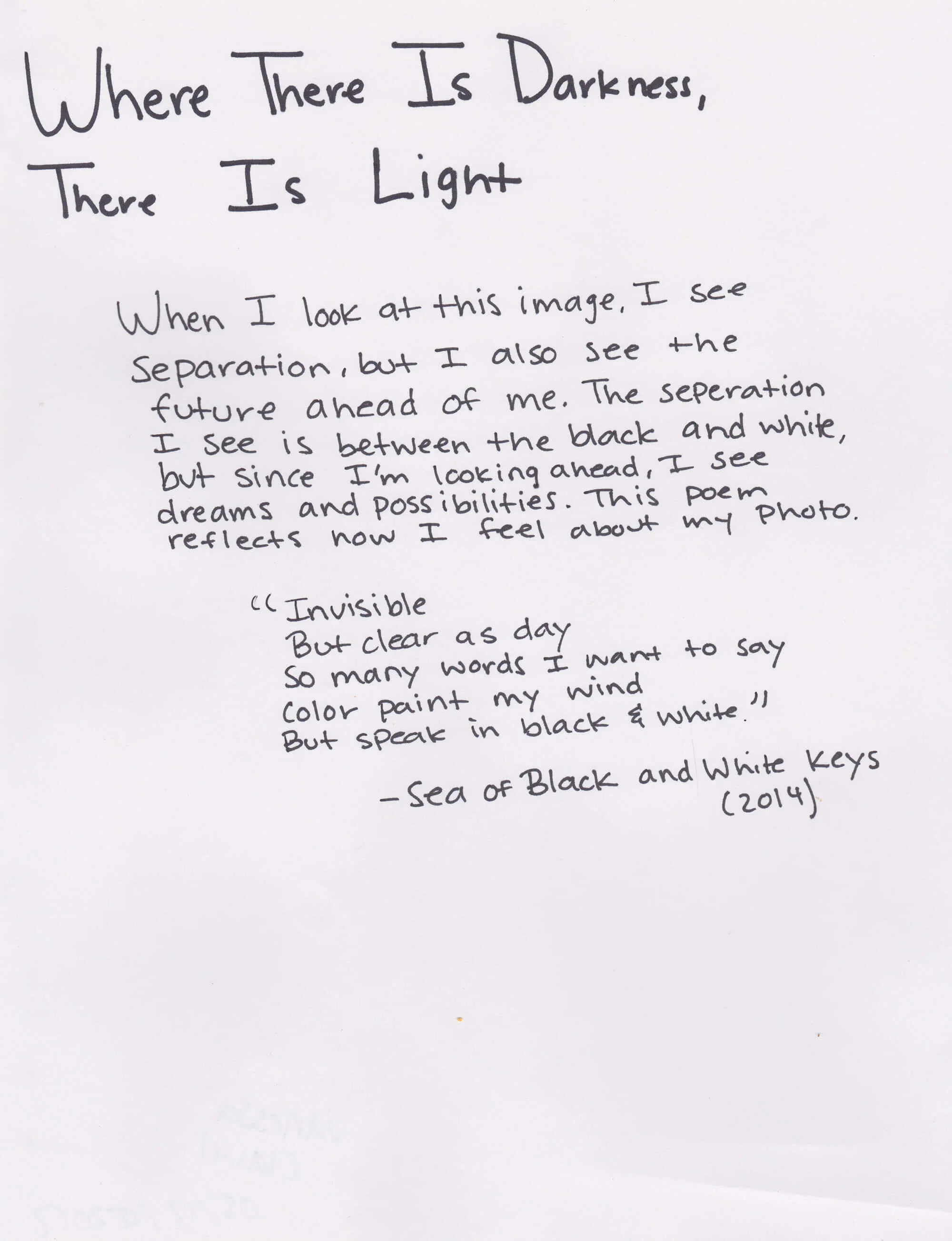 When I look at this image, I see separation, but I also see the future ahead of me. The separation is see is between the black and white, but since I'm looking ahead, I see dreams and possibilities. This poem reflects how I feel about my photo.
