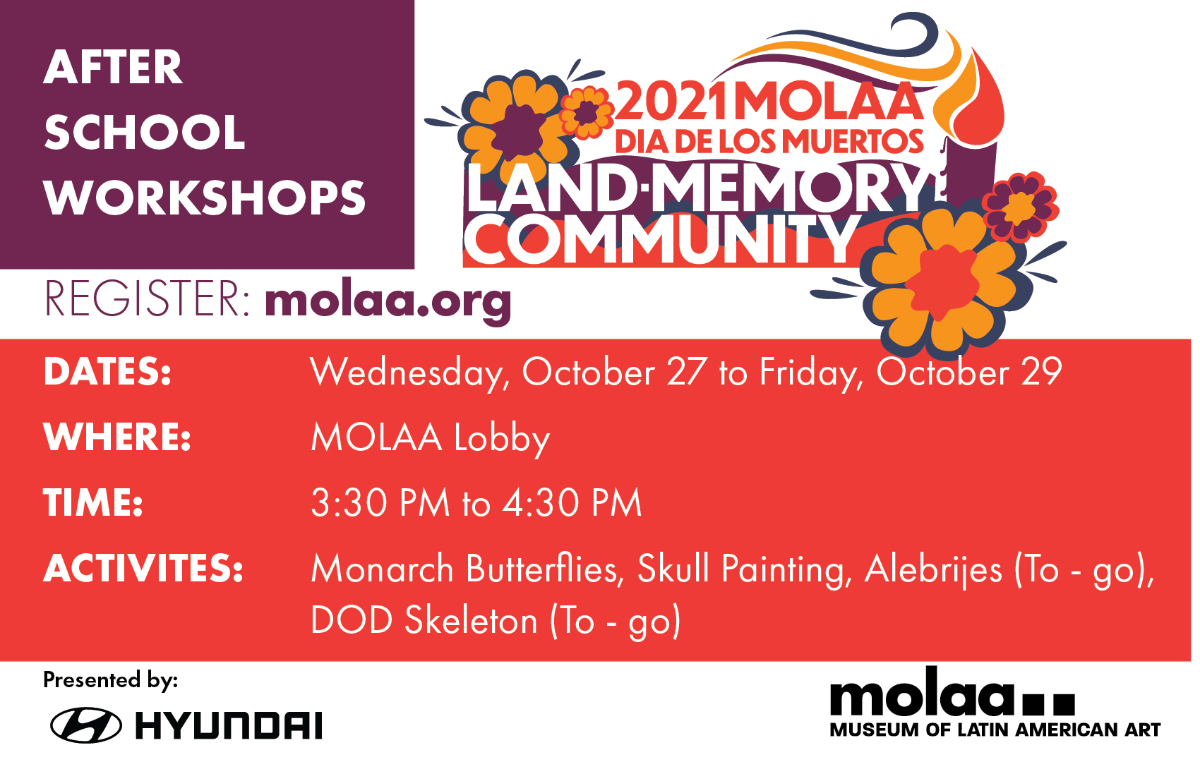 Join us for this After School workshop where you will participate in painting your calavera skull for this Day of the Dead. Learn about the meaning of this object to this traditional celebration. Registration is required. Please arrive on time, as space is limited. Your spot will be offered to another attendee if you arrive more than 15 minutes late.