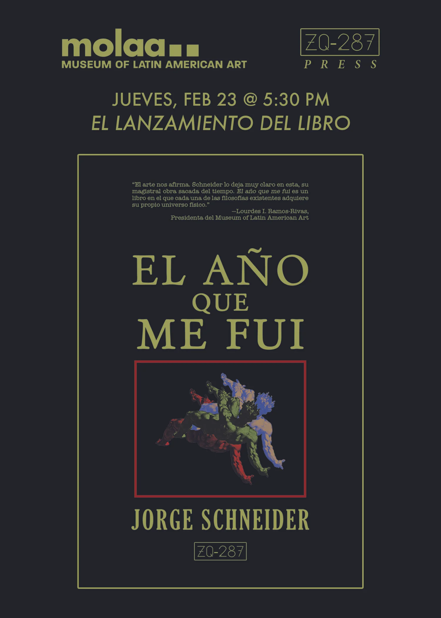 Jorge Schneider is an Argentinean writer and artist based out of LA. He is the author of La sombra de la langosta, La grieta, and El año que me fui. He owns and operates with his wife, Alejandra, the Menduina/Schneider Gallery in San Pedro, CA, which specializes in Latin American art. His books are widely available in libraries across the world.