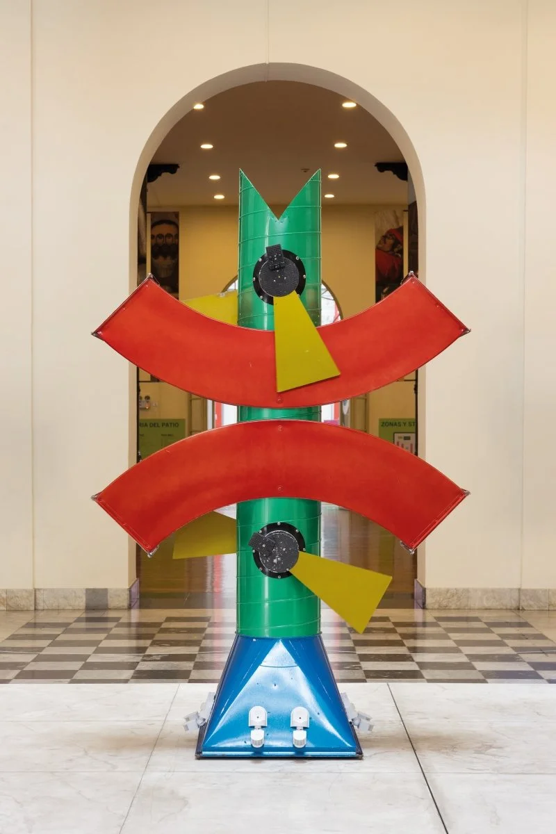 Gran Guacamayo Precolombino is a techno-zoomorphic sculpture made of industrial materials and recycled technology- four monitors, four Commodore AMIGA computers, motion sensors, and metallic ventilation tubes. Inspired by forms and primary colors (green, yellow, red, and blue) predominant in Amerindian cultures and objects, Mariotti created an almost 10 feet tall mechanical bird.