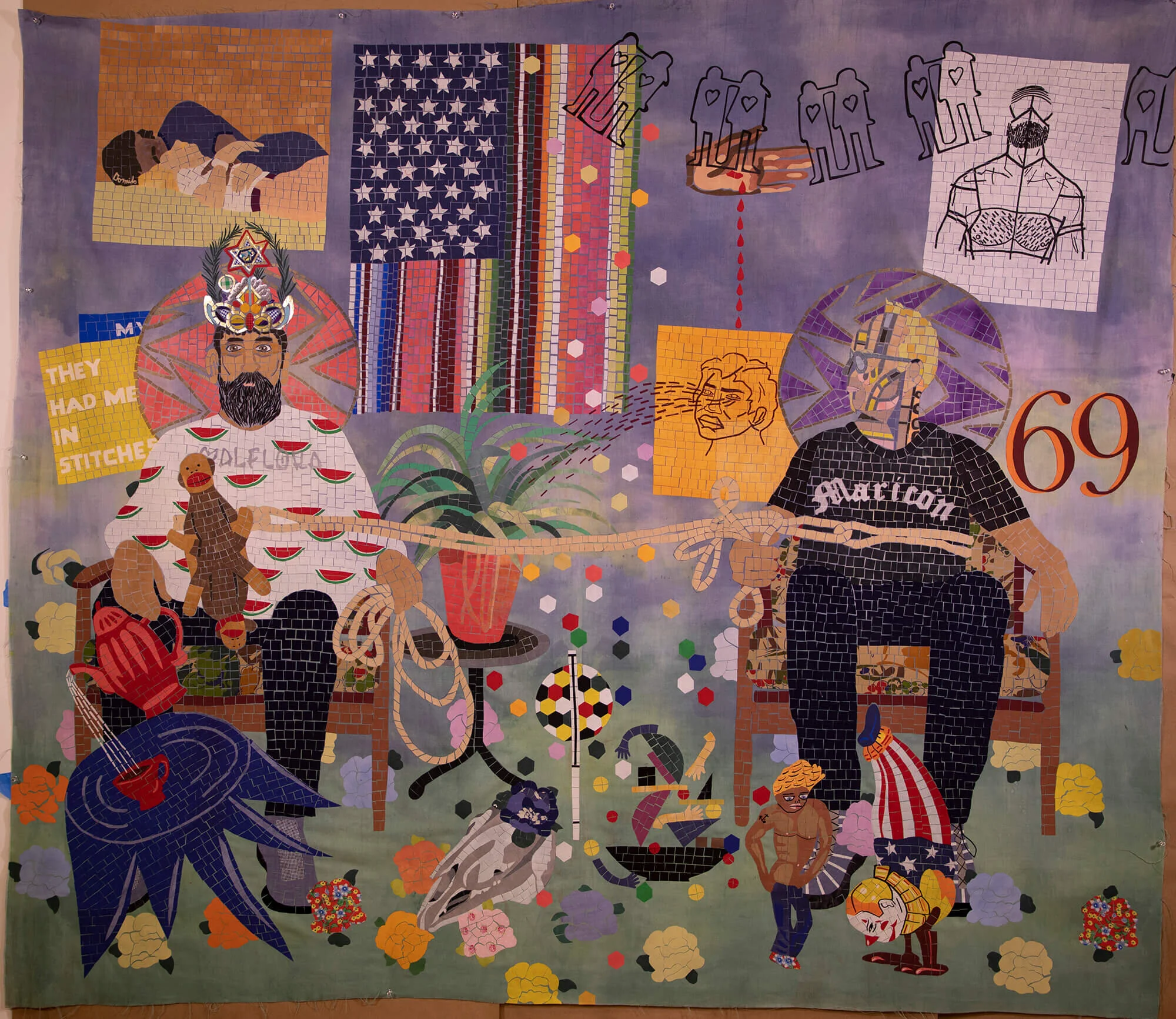 The installation includes the 120 ft. long textile flag that was created by the artists at MOLAA during their residency from March to June in 2019, along with over 3,000 community members from Long Beach and Los Angeles. The showcase will also present MOLAA's newest acquisition, Californian Family in Six Colors #1, by the artistic duo, as well as a recorded interview that addresses their creative process.